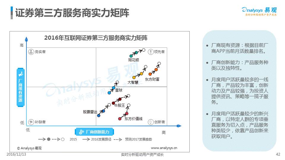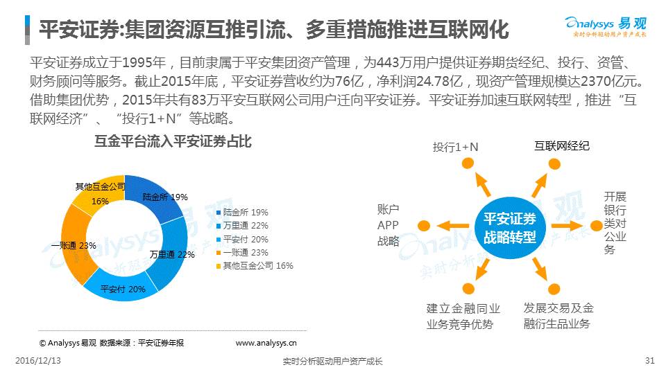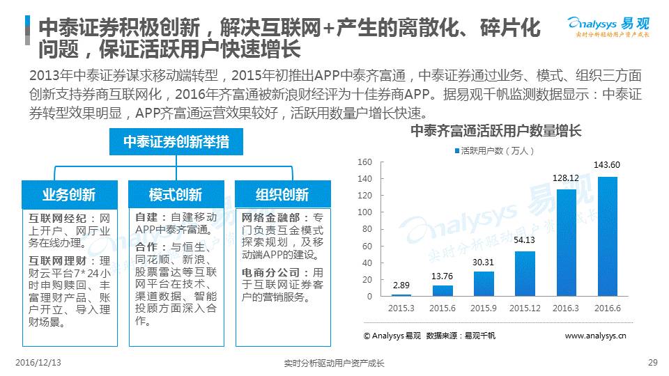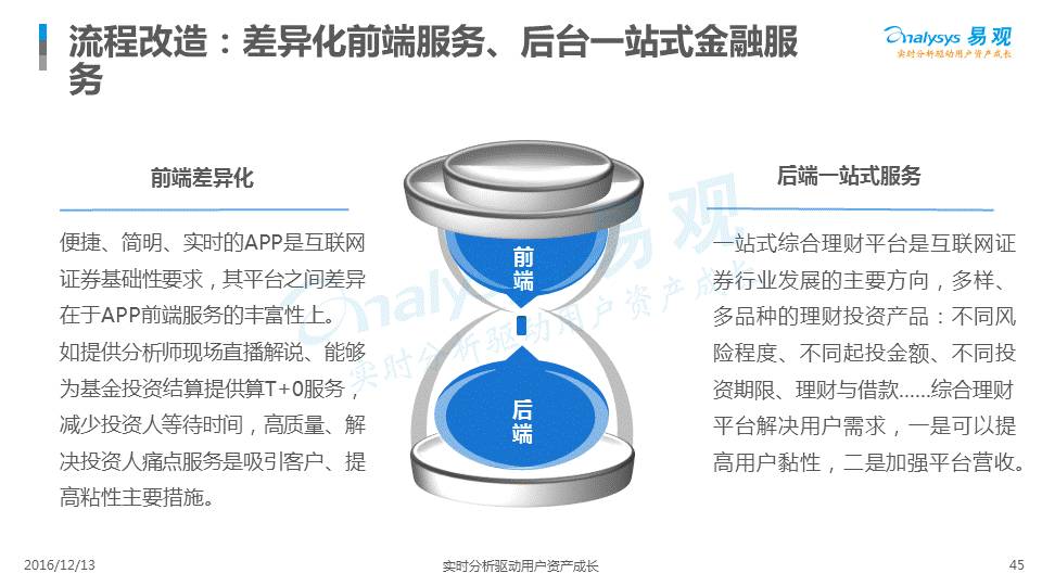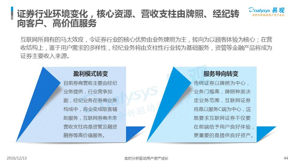 我国证券交易以互联网为主,随着非现场开户等政策出台以及移动终端的普及,证券移动互联网化发展迅猛,据易观千帆数据显示:2016年9月,证券服务应用,月活跃用户量约为1.3亿,移动端已成为主要发展方向。