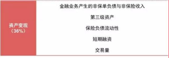资产变现维度主要关注保险公司面临的重大流动性风险,其中包括短期融资、短期内低经济处罚保单违约退保、证券交易量等。非保险业务的投入以及第三级资产中不易变现的投资资产均会降低保险公司的流动性。