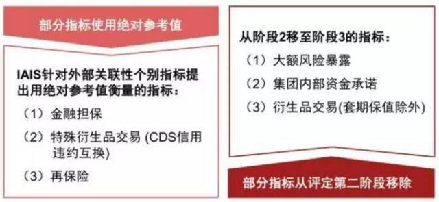 IAIS指出,绝对参考值通过计算相关指标在金融市场内(以2007年金融危机时的数据为基数)的绝对重要性而非参评机构间的相对重要性,从而减少指标之间的相关性;目前仅指定3个指标引用绝对参考值,但在未来三年会有更多指标使用绝对参考值。