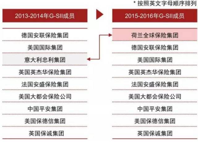自IAIS于2013年7月与FSB共同公布9家首批G-SII名单以来,FSB每年11月份公布最新名单。四年来,仅2015年的G-SII成员发生变化,意大利忠利集团出局,荷兰全球保险集团首次进入名单。由于IAIS和FSB并不公布评估的得分以及排名,所以我们无从对该变化进行深入分析,但这一变化应该反映了备选机构在业务结构和投资活动的变化以及监管机构的裁量。