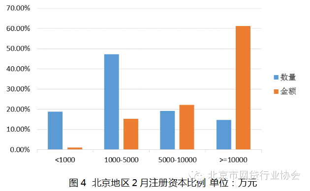 根据被统计的平台(含问题平台)来看,北京整体注册资本较高,注册资本达到5000 万的平台比例达到 33.88%,与上月持平,高于行业平均水平。注册金额 不小于 1 亿金额占比为 61.23%。