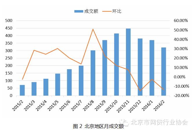 北京地区 2016 年 2 月成交额受过年影响降幅较大,继续上月的下跌趋势,环比 下降 13.37%,同比上升 355.72%。